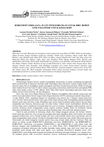 Purba, Lasman Parulian and Hidayat, Jemmy Immanuel and Libianto, Fernando Xaferius and Santosa, Lewi Ardy and Cynthiana, Cynthiana and Paola, Joseph and Saputra, Diio Rivaldo Pratama (2021) ROBOCHOP VERSI-ALFA: SUATU PENGEMBANGAN CETAK BIRU ROBOT LINE FOLLOWER UNTUK KEDAI KOPI. Prosiding Seminar Nasional Riset dan Teknologi Terapan (RITEKTRA) 2021, 1 (X). pp. C8-1. ISSN 2807-999X