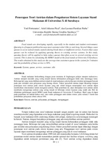 Stand makanan berkembang dengan pesat terutama di lingkungan pelajar maupun mahasiswa. Antrian menjadi masalah yang sering terjadi karena kebanyakan pelanggan tidak suka menunggu lama. Beberapa hal yang menyebabkan antrian terjadi di stand makanan yaitu ketika jam istirahat atau pelayanan yang kurang efisien. Faktor penyebab antrian dapat dikurangi dengan penerapan teori antrian pada sistem layanan yang ada. Pada penelitian ini, akan diterapkan teori antrian untuk membantu mengurangi antrian yang sering terjadi di beberapa sistem layanan yang sudah ada. Hal ini dilakukan perhitungan model M/M/1 pada Stand makanan di Universitas X Surabaya. Hasil yang di dapat pada penelitian ini adalah rata- rata waktu pelanggan mengantri dalam sistem selama 5 menit dan probabilitas pelayanan sibuk sebesar 50%.