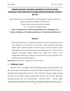 Kristianto, Ryan Putranda and Alexander, Edwin and Wahyuningsih, Yulia and Riti, Yosefina Finsensia and Tandjung, Stephanus Surijadarma and Hartanto, Andre (2022) PERANCANGAN APLIKASI ANDROID KATALOG BUKU DENGAN FITUR BARCODE SCANNER MENGGUNAKAN GOOGLE ML KIT. CSDS FT UKDC, 1 (1). pp. 9-14. ISSN 2964-1683