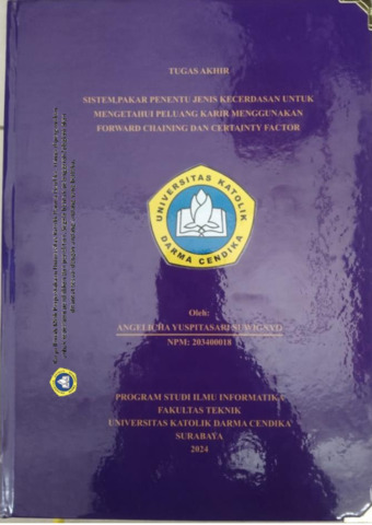 Suwignyo, Angelicha Yuspitasari (2024) Sistem Pakar Penentu Jenis Kecerdasan Untuk Mengetahui Peluang Karir Menggunakan Forward Chaining Dan Certainty Factor. Undergraduate thesis, Universitas Katolik Darma Cendika Fakultas Teknik.