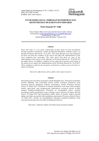 Nalle, Victor Imanuel W. (2016) STUDI SOSIO-LEGAL TERHADAP KETERTIBAN DAN KETENTRAMAN DI KABUPATEN SIDOARJO. Jurnal Hukum & Pembangunan, 46 (3). pp. 383-409. ISSN 2503-1465