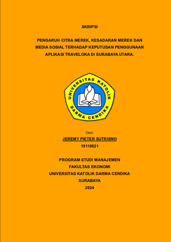 Sutrisno, Jeremy Pieter (2024) PENGARUH CITRA MEREK, KESADARAN MEREK DAN MEDIA SOSIAL TERHADAP KEPUTUSAN PENGGUNAAN APLIKASI TRAVELOKA DI SURABAYA UTARA. Undergraduate thesis, Universitas Katolik Darma Cendika Fakultas Ekonomi.