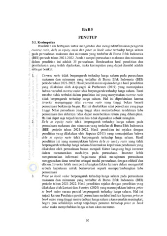 Penelitian ini bertujuan untuk mengidentifikasikan dan menguji: 1) Pengaruh Currentt Ratio terhadap Harga Saham pada Perusahaan Makanan dan Minuman yang terdaftar di Bursa Efek Indonesia (BEI) tahun 2021-2022, 2) Pengaruh Debt to Equity Ratio terhadap Harga Saham pada Perusahaan Makanan dan Minuman yang terdaftar di Bursa Efek Indonesia (BEI) tahun 2021-2022, 3) Pengaruh Price to Book Value terhadap Harga Saham Pada Perusahaan Makanan dan Minuman yang terdaftar di Bursa Efek Indonesia (BEI) tahun 2021-2022.
