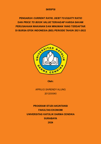 Alung, Aprilio Sarendy (2024) PENGARUH CURRENT RATIO, DEBT TO EQUITY RATIO DAN PRICE TO BOOK VALUE TERHADAP HARGA SAHAM PERUSAHAN MANUFAKTUR SUB SEKTOR MAKANAN DAN MINUMAN YANG TERDAFTAR DI BURSA EFEK INDONESIA PERIODE 2021-2022. Undergraduate thesis, Universitas Katolik Darma Cendika Fakultas Ekonomi.
