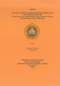 Awa, Adrianus Ole (2024) ANALISIS LAPORAN KEUANGAN DENGAN PENDEKATAN BALANCED SCORECARD (STUDI KASUS PERUSAHAAN ROKOK YANG TERDAFTAR DI BURSA EFEK INDONESIA TAHUN 2020-2022. Undergraduate thesis, Universitas Katolik Darma Cendika Fakultas Ekonomi.