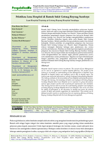 Dewi, Dian Retno Sari and Karijadi, Irene and Gunawan, Ivan and Wibowo, Wahyudi and Mulyana, Ig. Jaka and Hermanto, Yustinus Budi (2025) Pelatihan Lean Hospital di Rumah Sakit Gotong Royong Surabaya. PengabdianMu: Jurnal Ilmiah Pengabdian kepada Masyarakat, 10 (1). pp. 78-86. ISSN 2654-4385 (online); 2502-6828 (print)