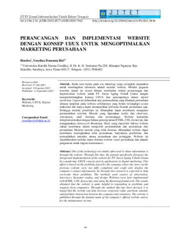 Hendra, Hendra and Riti, Yosefina Finsensia (2023) PERANCANGAN DAN IMPLEMENTASI WEBSITE DENGAN KONSEP UI/UX UNTUK MENGOPTIMALKAN MARKETING PERUSAHAAN. Jurnal Informatika dan Teknik Elektro Terapan (JITET), 11 (3s1). pp. 980-989. ISSN 2830-7062