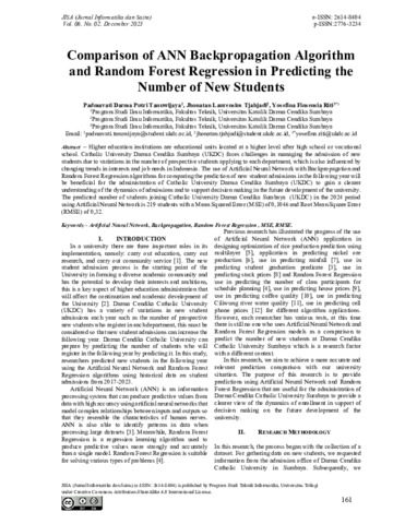 Tanuwijaya, Padmavati Darma Putri and Tjahjadi, Jhonatan Laurensius and Riti, Yosefina Finsensia (2023) Comparison of ANN Backpropagation Algorithm and Random Forest Regression in Predicting the Number of New Students. JISA (Jurnal Informatika dan Sains), 6 (2). pp. 161-166. ISSN 2614-8404
