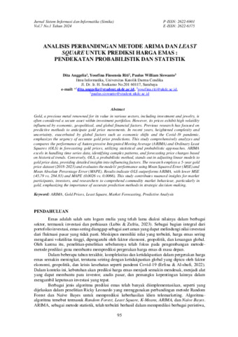 Anggelia, Dita and Riti, Yosefina Finsensia and Siswanto, Paulus William (2024) Analisis Perbandingan Metode Arima Dan Least Square Untuk Prediksi Harga Emas: Pendekatan Probabilistik Dan Statistik. Jurnal Sistem Informasi dan Informatika (Simika), 7 (1). pp. 95-103. ISSN P: 2622-6901 | E: 2622-6375