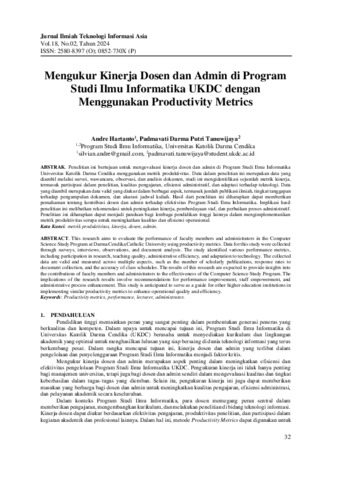 Hartanto, Andre and Tanuwijaya, Padmavati Darma Putri (2024) MENGUKUR KINERJA DOSEN DAN ADMIN DI PROGRAM STUDI ILMU INFORMATIKA UKDC DENGAN MENGGUNAKAN PRODUCTIVITY METRICS. Jurnal Ilmiah Teknologi Infomasi Asia, 18 (02). pp. 32-39. ISSN 2580-8397