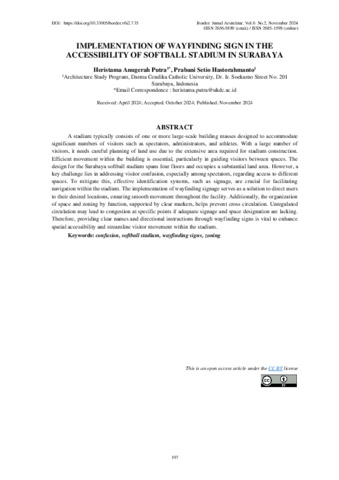 Putra, Heristama Anugerah and Hastorahmanto, Prabani Setio (2024) IMPLEMENTATION OF WAYFINDING SIGN IN THE ACCESSIBILITY OF SOFTBALL STADIUM IN SURABAYA. Border: Jurnal Arsitektur, 6 (2). pp. 197-212. ISSN 2656-5889 (cetak) / 2685-1598 (online)