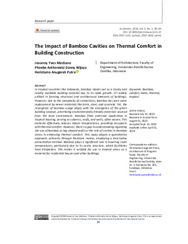 Modiano, Jovanny Yves and Wijaya, Phoebe Anthonieta Danny and Putra, Heristama Anugerah (2024) The Impact of Bamboo Cavities on Thermal Comfort in Building Construction. ARCHIMANE Journal of Architecture and Human Experience, 2 (1). pp. 39-50. ISSN p-ISSN: 2987-4033 e-ISSN: 2987-1131