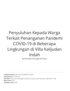 Putra, Heristama Anugerah and Siswanto, Agustina Ivana and Dena, Fransiska and Kristyawan, Angga Rezaldy Kristyawan and Novitalia, Putri Indah and Putra, Yosua Anggun (2021) Penyuluhan Kepada Warga Terkait Penanganan Pandemi COVID-19 di Beberapa Lingkungan di Villa Kalijudan Indah. LOSARI: Jurnal Pengabdian Kepada Masyarakat, 3 (2). pp. 56-63. ISSN e: 2684-8678 | p: 2684-9887