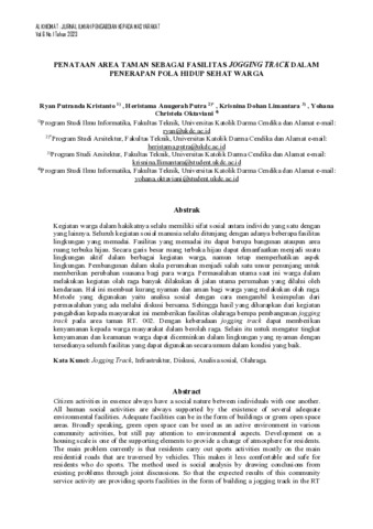 Kristianto, Ryan Putranda and Putra, Heristama Anugerah and Limantara, Krisnina Dohan and Oktaviani, Yohana Christela (2023) PENATAAN AREA TAMAN SEBAGAI FASILITAS JOGGING TRACK DALAM PENERAPAN POLA HIDUP SEHAT WARGA. AL KHIDMAT : JURNAL ILMIAH PENGABDIAN KEPADA MASYARAKAT, 6 (1). pp. 69-80. ISSN ISSN 2654- 4431 (print), ISSN 2623-2006 (online)