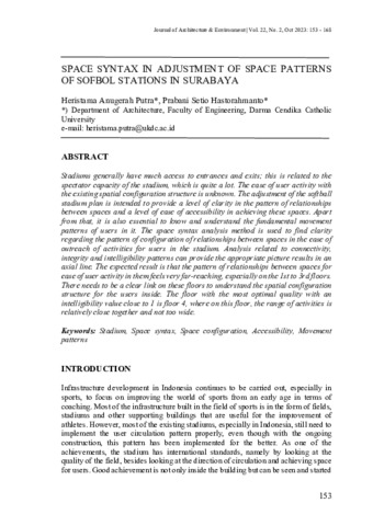 Putra, Heristama Anugerah and Hastorahmanto, Prabani Setio (2023) SPACE SYNTAX IN ADJUSTMENT OF SPACE PATTERNS OF SOFBOL STATIONS IN SURABAYA. Journal of Architecture & ENVIRONMENT, 22 (2). pp. 153-168. ISSN E: 2355-262X