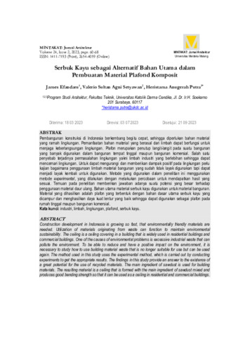 Efandaru, James and Setyawan, Valerio Sultan Agni and Putra, Heristama Anugerah (2023) Serbuk Kayu sebagai Alternatif Bahan Utama dalam Pembuatan Material Plafond Komposit. Mintakat : Jurnal Arsitektur, 24 (2). pp. 60-68. ISSN : 1411-7193 (Print), 2654-4059 (Online)