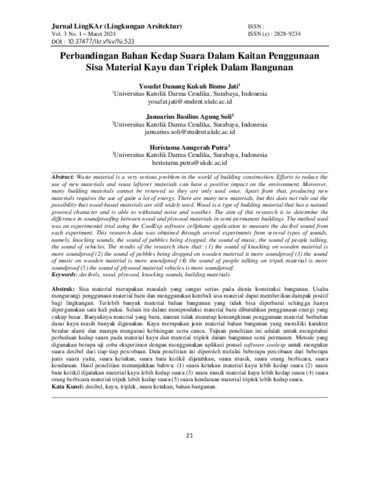 Jati, Yosafat Danang Kukuh Bismo and Soli, Januarius Basilius Agung and Putra, Heristama Anugerah (2024) Perbandingan Bahan Kedap Suara Dalam Kaitan Penggunaan Sisa Material Kayu dan Triplek Dalam Bangunan. LingKAr (Lingkungan Arsitektur), 3 (1). pp. 21-30. ISSN (e) : 2828-9234