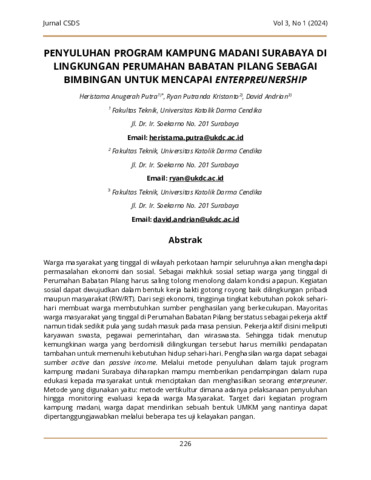 Putra, Heristama Anugerah and Kristianto, Ryan Putranda and Andrian, David (2024) PENYULUHAN PROGRAM KAMPUNG MADANI SURABAYA DI LINGKUNGAN PERUMAHAN BABATAN PILANG SEBAGAI BIMBINGAN UNTUK MENCAPAI ENTERPREUNERSHIP. The Center for Sustainable Development Studies Journal (Jurnal CSDS), 3 (1). pp. 226-234. ISSN 2964-1683