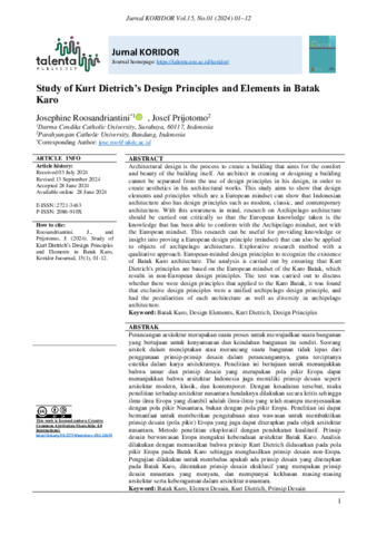 Roosandriantini, Josephine and Prijotomo, Josef (2024) Study of Kurt Dietrich’s Design Principles and Elements in Batak Karo. Jurnal Koridor, 15 (1). pp. 1-12. ISSN 2721-3463