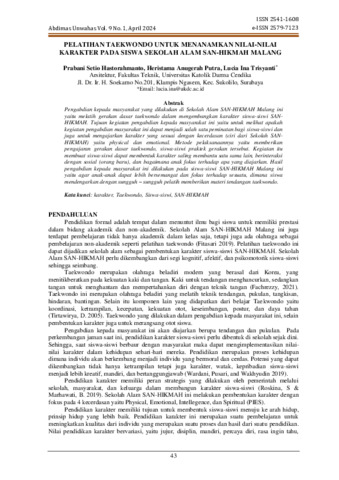 Hastorahmanto, Prabani Setio and Putra, Heristama Anugerah and Trisjanti, Lucia Ina (2024) PELATIHAN TAEKWONDO UNTUK MENANAMKAN NILAI-NILAI KARAKTER PADA SISWA SEKOLAH ALAM SAN-HIKMAH MALANG. Abdimas Unwahas, 9 (2). pp. 43-50. ISSN 2541-1608 2579-7123