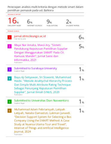 4. HASIL SIMILARITY-Penerapan analisis multi kriteria dengan metode smart dalam pemilihan pemasok pada ud. Bahtera.pdf Download (2MB) | Preview |