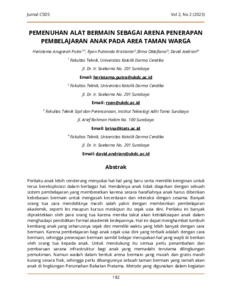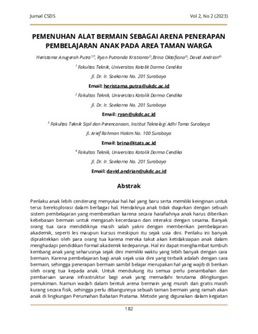 Putra, Heristama Anugerah and Kristianto, Ryan Putranda and Oktafiana, Brina and Andrian, David (2023) PEMENUHAN ALAT BERMAIN SEBAGAI ARENA PENERAPAN PEMBELAJARAN ANAK PADA AREA TAMAN WARGA. The Center For Sustainable Development Studies Journal (Jurnal CSDS), 2 (2). pp. 182-192. ISSN 2964-1683 (media online)