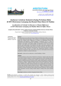 Roosandriantini, Josephine and Trisyanti, Lucia Ina (2023) Akulturasi Arsitektur Kolonial terhadap Perbedaan Iklim di SDN Ditotruman Lumajang dan Rumah Dinas Bakorwil Madiun. ARSITEKTURA Jurnal Ilmiah Arsitektur dan Lingkungan Binaan, 21 (1). pp. 27-38. ISSN 2580-2976