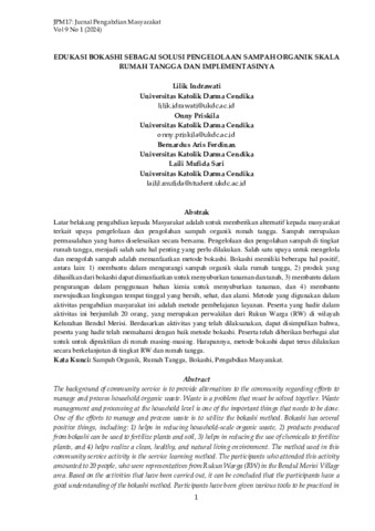 Indrawati, Lilik and Priskila, Onny and Ferdinan, Bernadus Aris and Sari, Laili Mufida (2024) EDUKASI BOKASHI SEBAGAI SOLUSI PENGELOLAAN SAMPAH ORGANIK SKALA RUMAH TANGGA DAN IMPLEMENTASINYA. JPM17: Jurnal Pengabdian Masyarakat, 9 (1). pp. 1-9. ISSN P: 2579-3853 E: 2407-7100