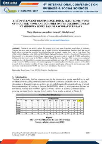 Larasati, Maria Kharisma Anggun Putri and Indrawati, Lilik (2024) THE INFLUENCE OF BRAND IMAGE, PRICE, ELECTRONIC WORD OF MOUTH (E-WOM), AND COMFORT ON THE DECISION TO STAY AT MIDTOWN HOTEL BASUKI RACHMAT SURABAYA. In: Proceeding International Conference on Business & Social Sciences. Surabaya, October 26-27th, 2024. (ICOBUSS), 4th . STIESIA, Surabaya, pp. 1281-1292. ISBN (Online) 2746-5667