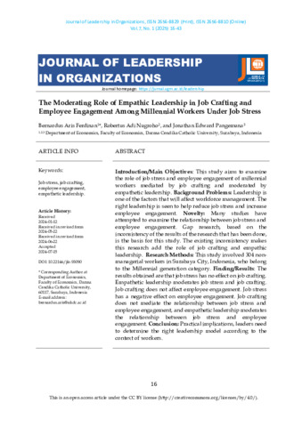 Ferdinan, Bernadus Aris and Nugroho, Robertus Adi and Pangemana, Jonathan Edward (2025) The Moderating Role of Empathic Leadership in Job Crafting and Employee Engagement Among Millennial Workers Under Job Stress. Journal of Leadership in Organizations (JLO), 7 (1). pp. 16-43. ISSN 2656-8810