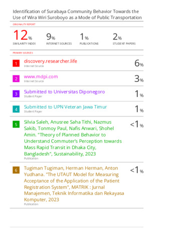 Hasil Similarity_Identification of Surabaya Community Behavior Towards the Use of Wira Wiri Suroboyo as a Mode of Public Transportation.pdf Download (2MB) | Preview |