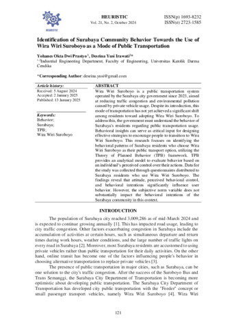 Okta Dwi Prastyo, Yohanes and Irawati, Desrina Yusi (2024) Identification of Surabaya Community Behavior Towards the Use of Wira Wiri Suroboyo as a Mode of Public Transportation. HEURISTIC, 21 (2). pp. 121-130. ISSN ISSN(p) 1693-8232, ISSN(e) 2723-1585