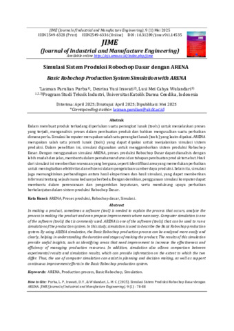 Purba, Lasman Parulian and Irawati, Desrina Yusi and Wulandari, Lusi Mei Cahya (2025) Simulasi Sistem Produksi Robochop Dasar dengan ARENA. JIME (Journal of Industrial and Manufacture Engineering), 9 (1). ISSN ISSN 2549-6328 (Print) ISSN2549-6336 (Online)