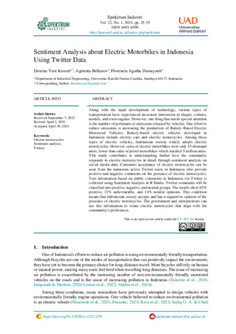 Irawati, Desrina Yusi and Bellanov, Agrienta and Damayanti, Florencia Agatha (2024) Sentiment Analysis about Electric Motorbikes in Indonesia Using Twitter Data. Spektrum Industri, 22 (1). pp. 1693-6530. ISSN P: 1693-6590 E: 2442-2630