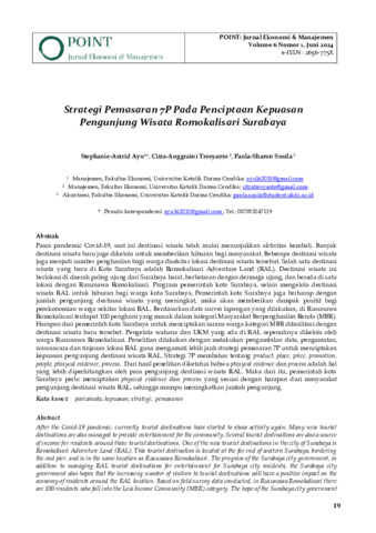 Ayu, Stephanie Astrid and Tresyanto, Citra Anggraini and Susila, Paola Sharon (2024) STRATEGI PEMASARAN 7P PADA PENCIPTAAN KEPUASAN PENGUNJUNG WISATA ROMOKALISARI SURABAYA. Jurnal Point, Jurnal Ekonomi & Manajemen, 6 (1). pp. 19-29. ISSN 2656-775X