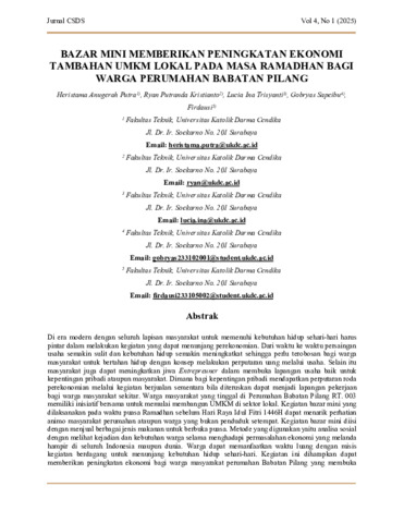Putra, Heristama Anugerah and Kristianto, Ryan Putranda and Trisyanti, Lucia Ina and Sapeibu, Gobryas and Firdausi, Firdausi (2025) BAZAR MINI MEMBERIKAN PENINGKATAN EKONOMI TAMBAHAN UMKM LOKAL PADA MASA RAMADHAN BAGI WARGA PERUMAHAN BABATAN PILANG. The Center for Sustainable Development Studies Journal (Jurnal CSDS), 4 (1). pp. 1-10. ISSN 2964-1683