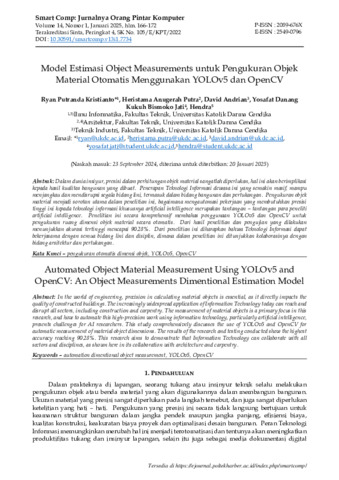 Kristianto, Ryan Putranda and Putra, Heristama Anugerah and Andrian, David and Jati, Yosafat Danang Kukuh Bismo and Hendra, Hendra (2025) Model Estimasi Object Measurements untuk Pengukuran Objek Material Otomatis Menggunakan YOLOv5 dan OpenCV. Smart Comp Jurnalnya Orang Pintar Komputer, 14 (1). pp. 166-172. ISSN 2549-0796