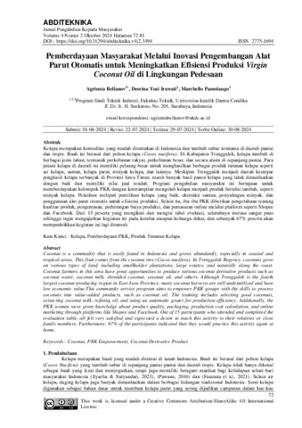 Pemberdayaan Masyarakat Melalui Inovasi Pengembangan Alat Parut Otomatis untuk MeningkatkanProduksi Virgin Coconut Oil di.pdf Download (840kB) | Preview |