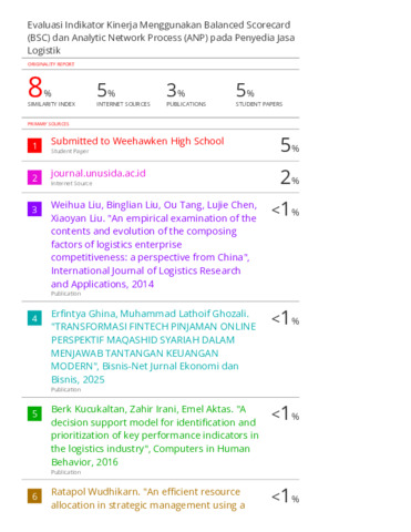 Wulandari, Lusi Mei Cahya and Nurhayati, Lilis and Narendra, Ravaelino Dimas Eka Evaluasi Indikator Kinerja Menggunakan Balanced Scorecard (BSC) dan Analytic Network Process (ANP) pada Penyedia Jasa Logistik. Journal of Research and Technology, 11 (1). pp. 127-139. ISSN 2477-6165
