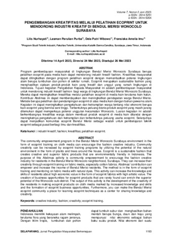 Nurhayati, Lilis and Purba, Lasman Parulian and Imu, Fransiska Amelia (2023) PENGEMBANGAN KREATIFITAS MELALUI PELATIHAN ECOPRINT UNTUK MENDORONG INDUSTRI KREATIF DI BENDUL MERISI WONOCOLO SURABAYA. Jurnal Selaparang, 7 (2). ISSN 2614-526X