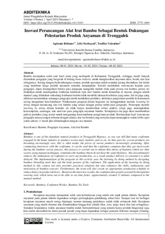 Bellanov, Agrienta and Nurhayati, Lilis (2024) Inovasi Perancangan Alat Irat Bambu Sebagai Bentuk Dukungan Pelestarian Produk Anyaman di Trenggalek. ABDITEKNIKA Jurnal Pengabdian Kepada Masyarakat, 4 (1). pp. 1-7. ISSN 2775-1694