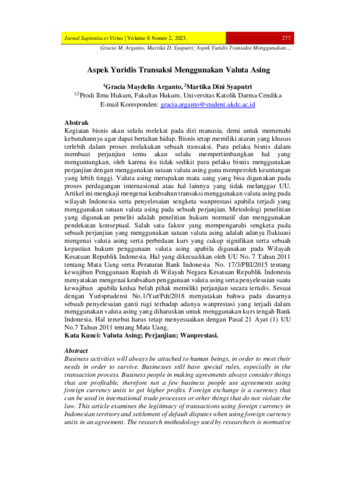 Arganto, Gracia and Syaputri, Martika Dini (2023) Aspek Yuridis Transaksi Menggunakan Valuta Asing. Jurnal Sapientia et Virtus, 8 (2). pp. 277-291. ISSN e: 2716-2273 p: 2355-343X