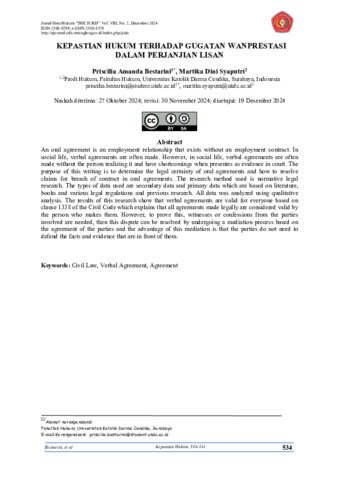 Bestarini, Priscilia and Syaputri, Martika Dini (2024) KEPASTIAN HUKUM TERHADAP GUGATAN WANPRESTASI DALAM PERJANJIAN LISAN. Jurnal Ilmu Hukum The Juris, 8 (2). pp. 534-541. ISSN e: 2580-8370 | p: 2580-0299