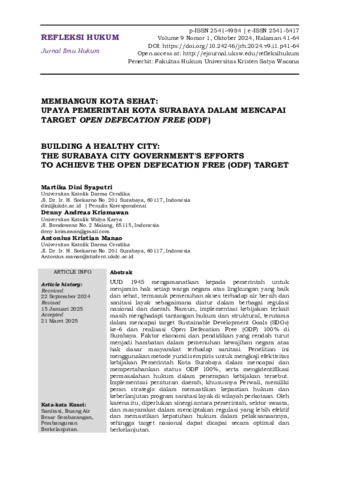 Syaputri, Martika Dini and Krismawan, Denny Andreas and Manao, Antonius Kristian (2024) MEMBANGUN KOTA SEHAT UPAYAPEMERINTAH KOTA SURABAYA DALAM MENCAPAI TARGET OPEN DEFECATION FREE(ODF). Refleksi Hukum: Jurnal Ilmu Hukum, 9 (1). pp. 41-64. ISSN p: 2541-4984, e: 2541-5417