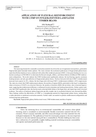 Nurhayati, Lilis and Dewi, Sri Murni and Wisnumurti, Wisnumurti and Nuralinah, Devi (2026) APPLICATION OF FLEXURAL REINFORCEMENT WITH CFRP ON FINGER-JOINTED LAMINATED TIMBER BEAMS. EUREKA: Physics and Engineering, 1 (1). pp. 168-180. ISSN 2461-4254