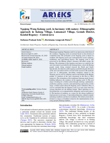Setio, Stefanus Prabani and Putra, Heristama Anugerah (2024) Ngajeng Wong Kalang yard, in harmony with nature: Ethnographic approach in Kalang Village, Lumansari Village, Gemuh District, Kendal Regency - Central Java. ARTEKS: Jurnal Teknik Arsitektur, 9 (1). pp. 1-10. ISSN 2541-0598 (p) , 2541-1217 (e)