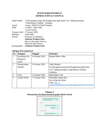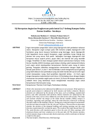 Matthew, Nicholas Joe and Setio, Stefanus Prabani and Santosa, Hosea Alessandro Santosa A and Kirana, Marcella Intan (2026) Uji Kecepatan Angin dan Penghawaan pada lantai 5,6,7 Gedung Kampus Unika Darma Cendika - Surabaya. Jurnal Adijaya Multidisiplin, 3 (6). pp. 1049-1060. ISSN 2964-7606