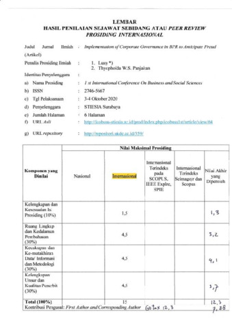 Lusy, Lusy and Panjaitan, Thyophoida W.S. (2020) Implementation Of Corporate Govenance In BPR To Anticipate Fraud. In: 1st INTERNATIONAL CONFERENCE ON BUSINESS AND SOCIAL SCIENCES. STIESIA Surabaya, Surabaya, pp. 679-684. ISBN 2746-5667