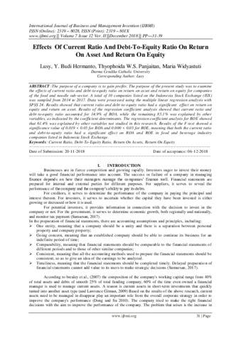 Lusy, Lusy and Hermanto, Yustinus Budi and Panjaitan, Thyophoida W.S. and Widyastuti, Maria (2018) Effects Of Current Ratio And Debt-To-Equity Ratio On Return On Asset And Return On Equity. International Journal of Business and Management Invention (IJBMI), 7 (12v2). pp. 31-39. ISSN ISSN (Online): 2319 – 8028, ISSN (Print): 2319 – 801X