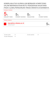 improve the curriculum and to adapt to the world of work today. The conclusion which is gained in this research states that the curriculum of bachelor degree’s accounting study program at faculty of economics Wijaya Putra University, faculty of economics Darma Cendika Catholic university and Faculty Of Economics Merdeka University, implementation of KBK’s continuance requires much more gradually and continually improvement. While Faculty Of Business Widya Mandala Catholic University And Indonesia School Of Economics (STIESIA) have applied competency-based curriculum eventhough there is still much that needs to be improved gradually and continually so as to produce the quality of the college itself and the quality of graduates.